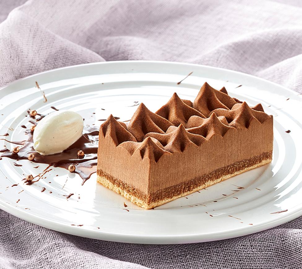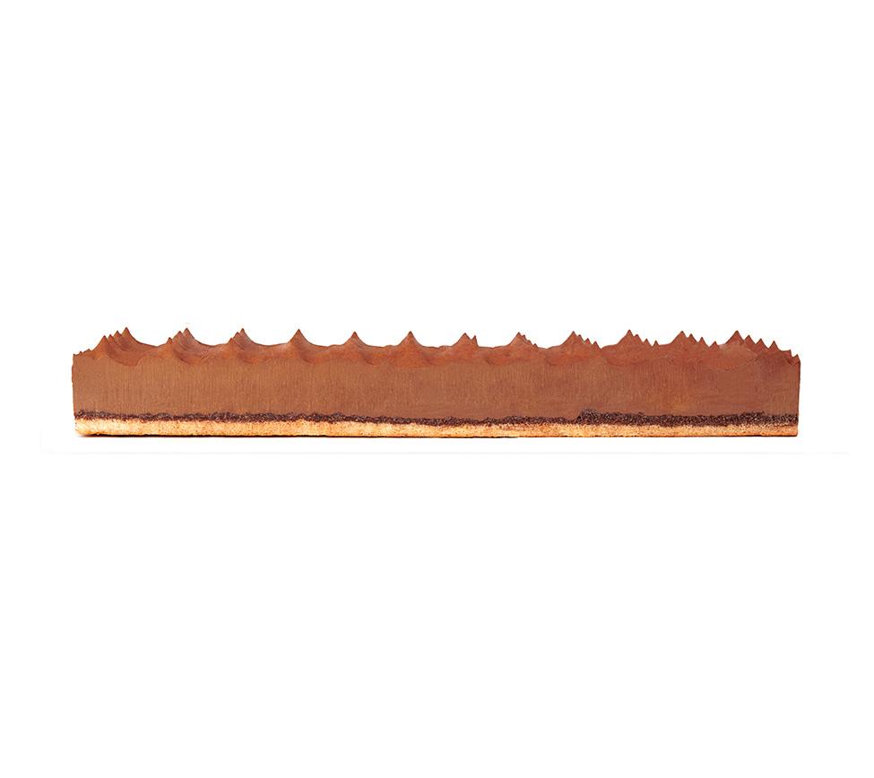Sponge cake, crunchy layer of dark chocolate, dark chocolate, cocoa velvet decoration (29% chocolate).