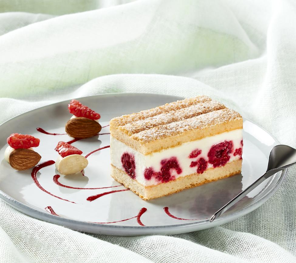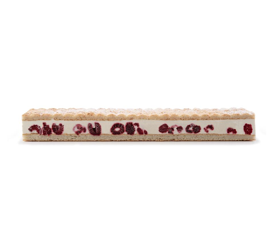 Sponge cake, vanilla mousse, whole raspberries, almond biscuit, grated coconut (22% raspberries).