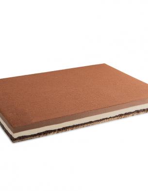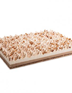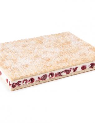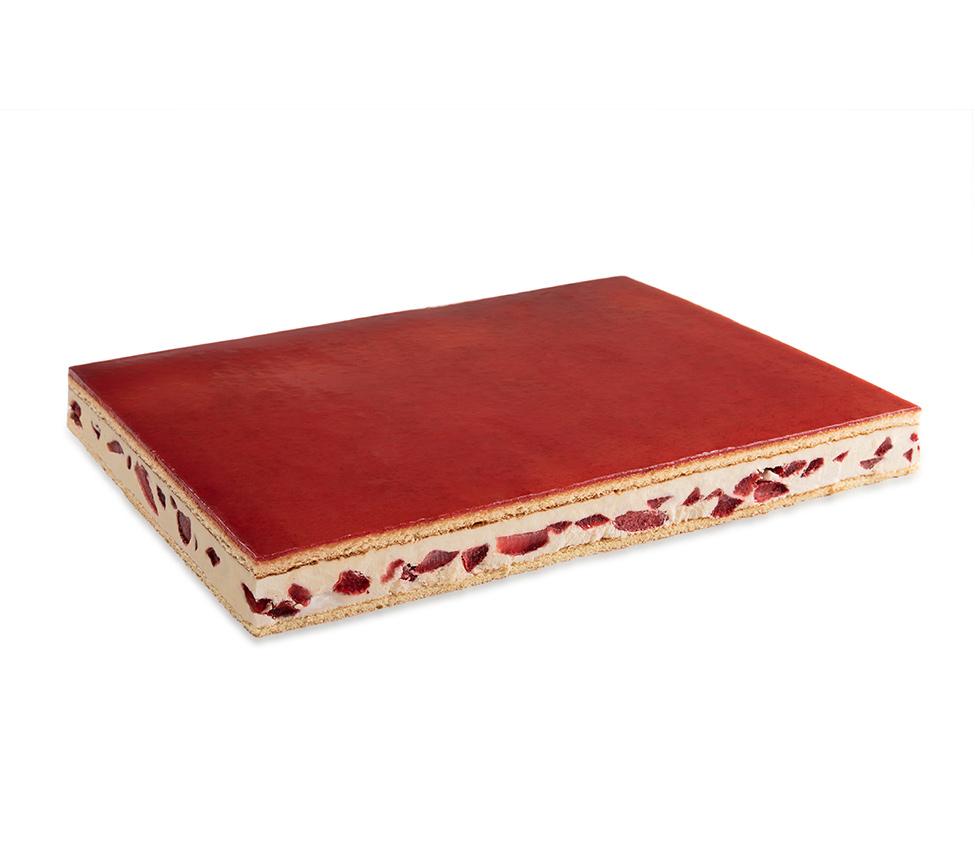 Sponge cake, strawberry dices, vanilla cream, a layer of sponger, red fruit topping (26% strawberries).