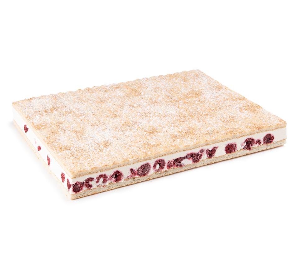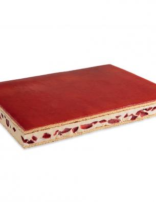 Sponge cake, vanilla mousse, whole raspberries, almond biscuit, grated coconut (22% raspberries).