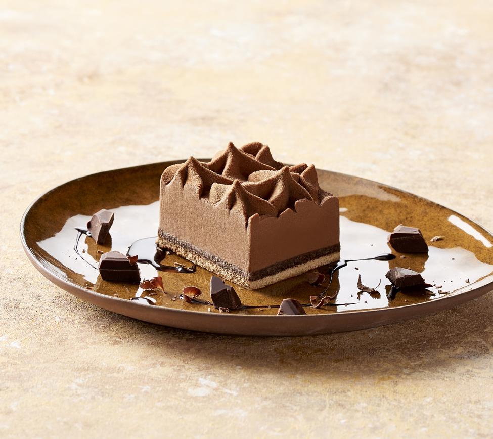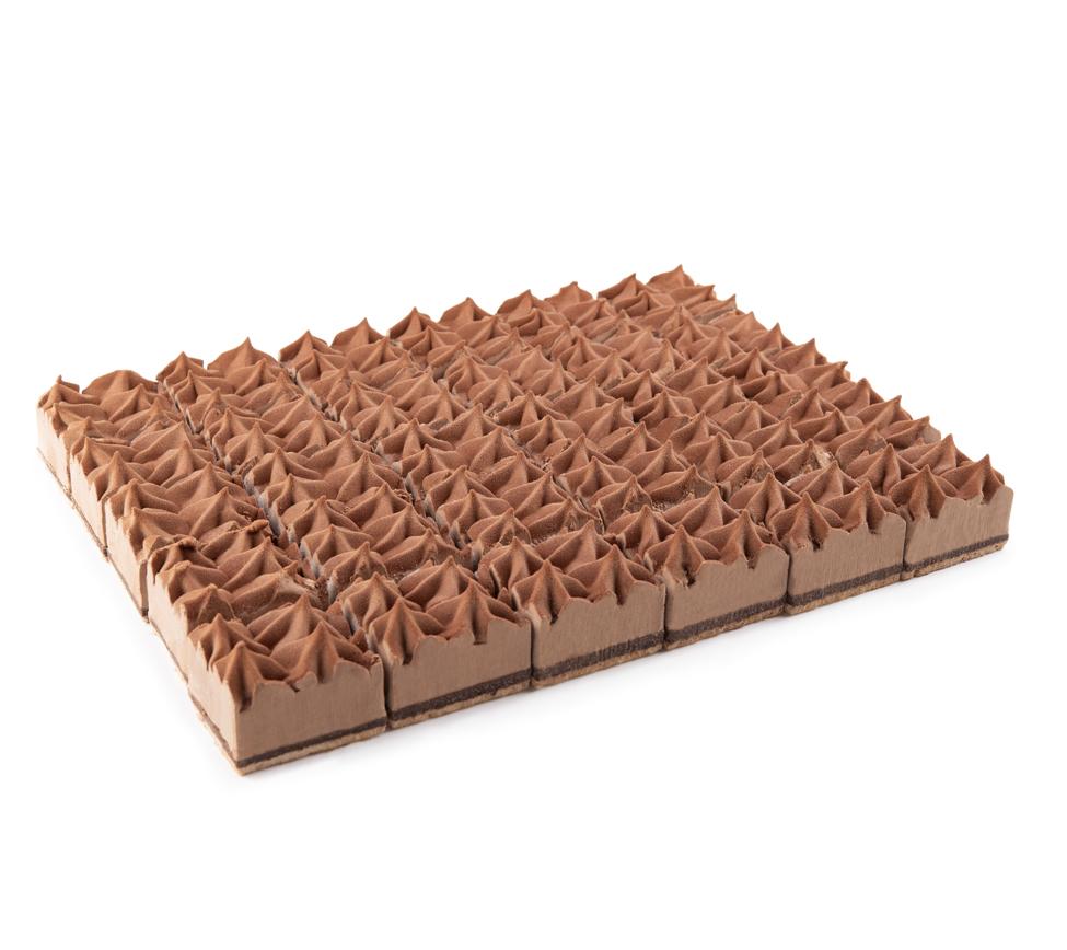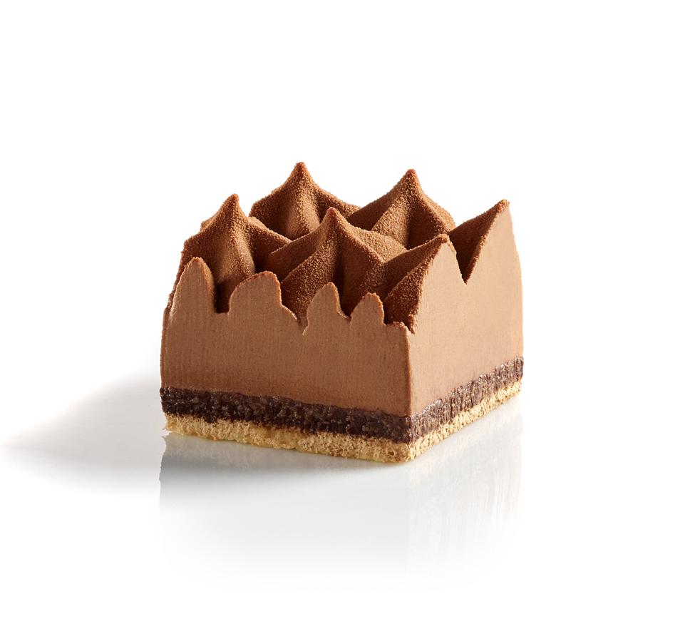 Sponge cake, crunchy layer of dark chocolate, dark chocolate, cocoa velvet decoration (29% chocolate).