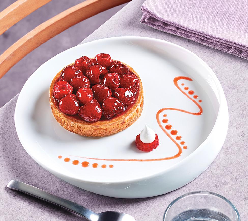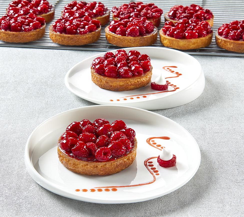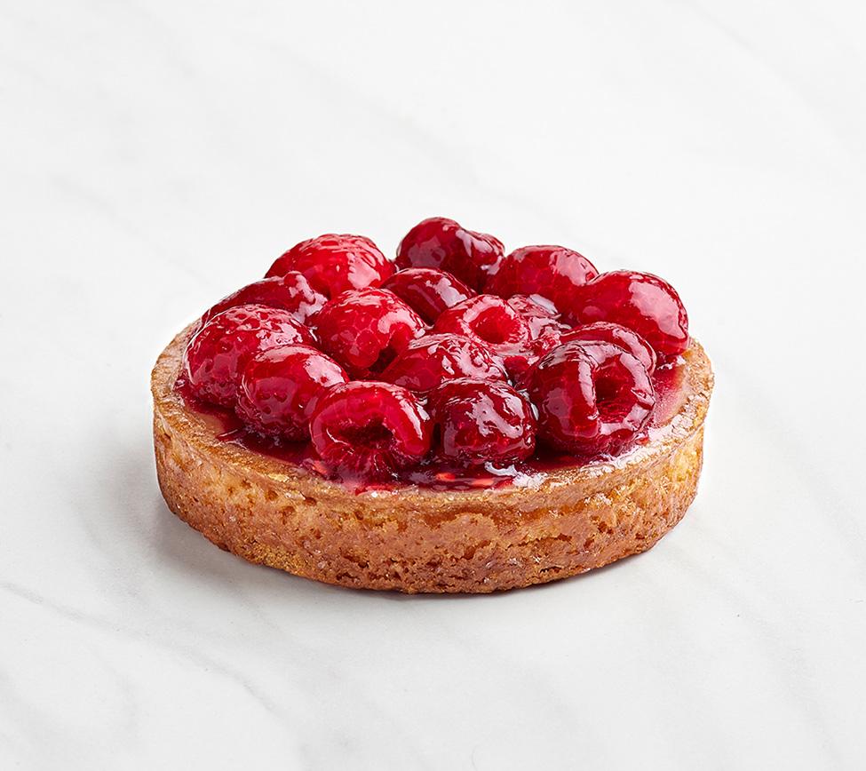 All butter shortcrust pastry, almond cream, whole raspberries and raspberry jelly. (30% raspberry)