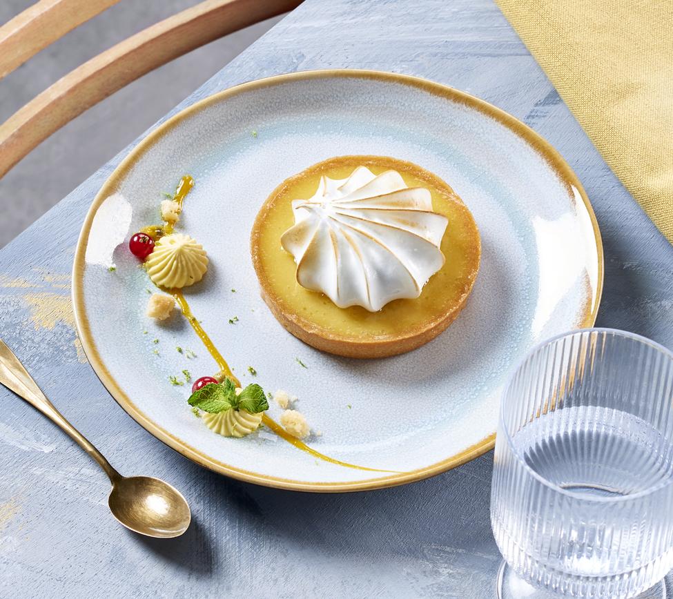 All butter shortcrust sweet pastry, passionfruit jelly and cream, topped with poached italian meringue.