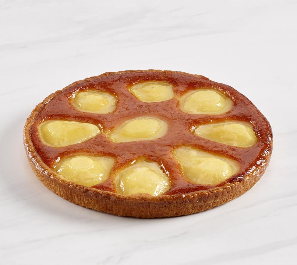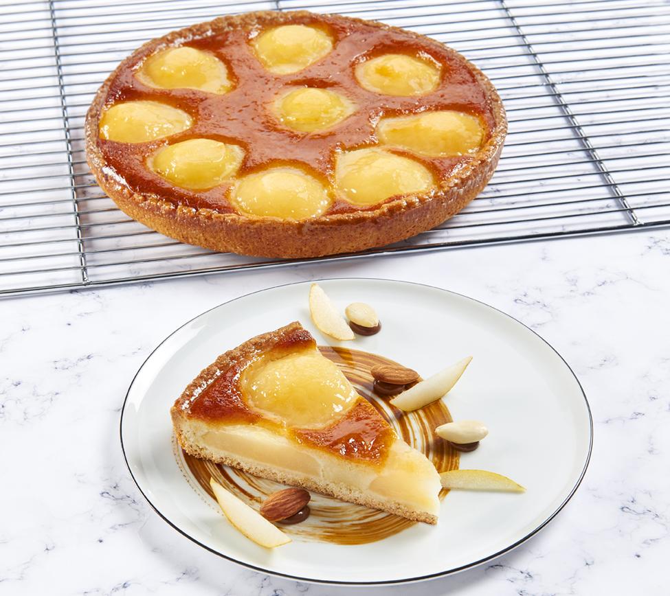 Pure butter shortcrust pastry, frangipane filling, halved William pears (40% pears).