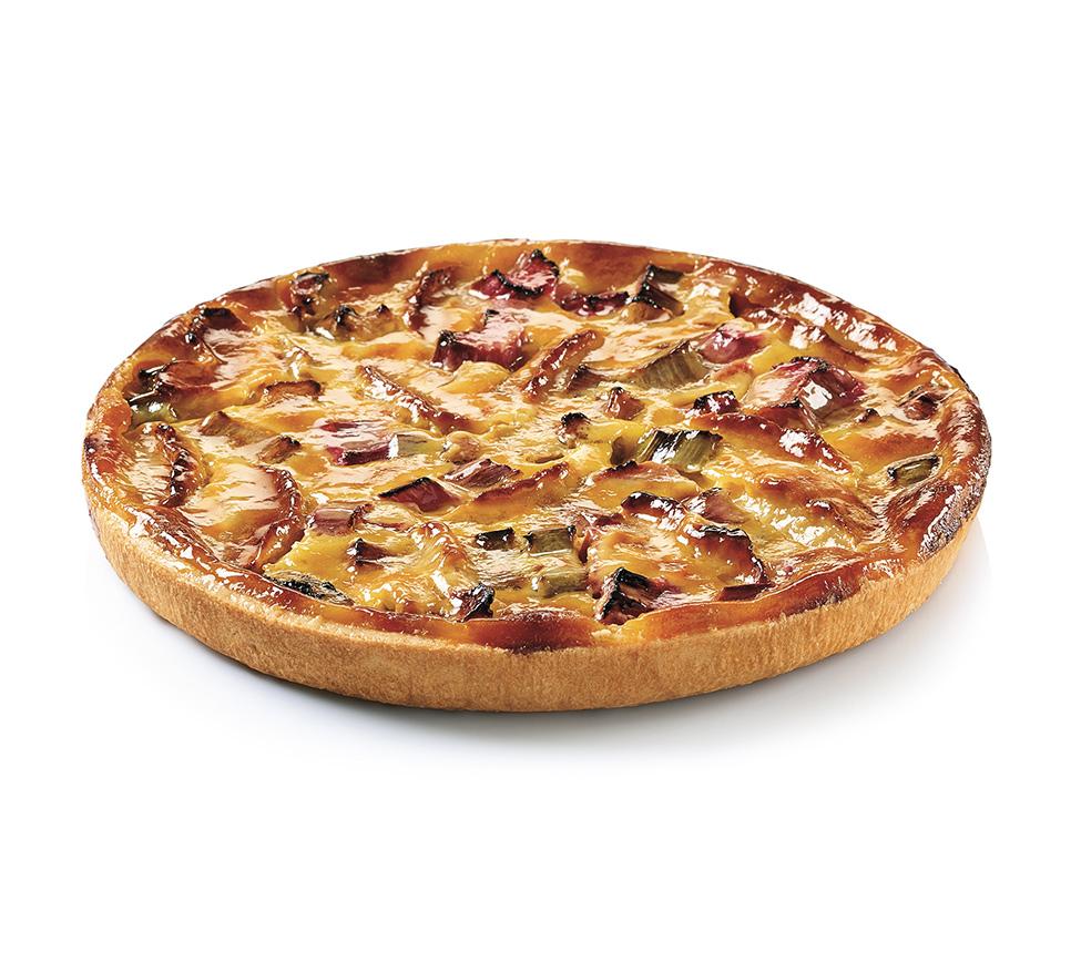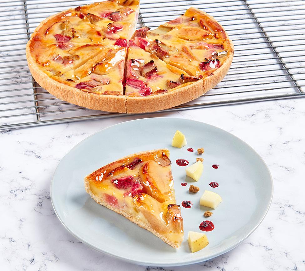 All butter shortcrust pastry, custard filling made with eggs, fresh apples cut into quarters and pieces of rhubarb. (35% apple and rhubarb)