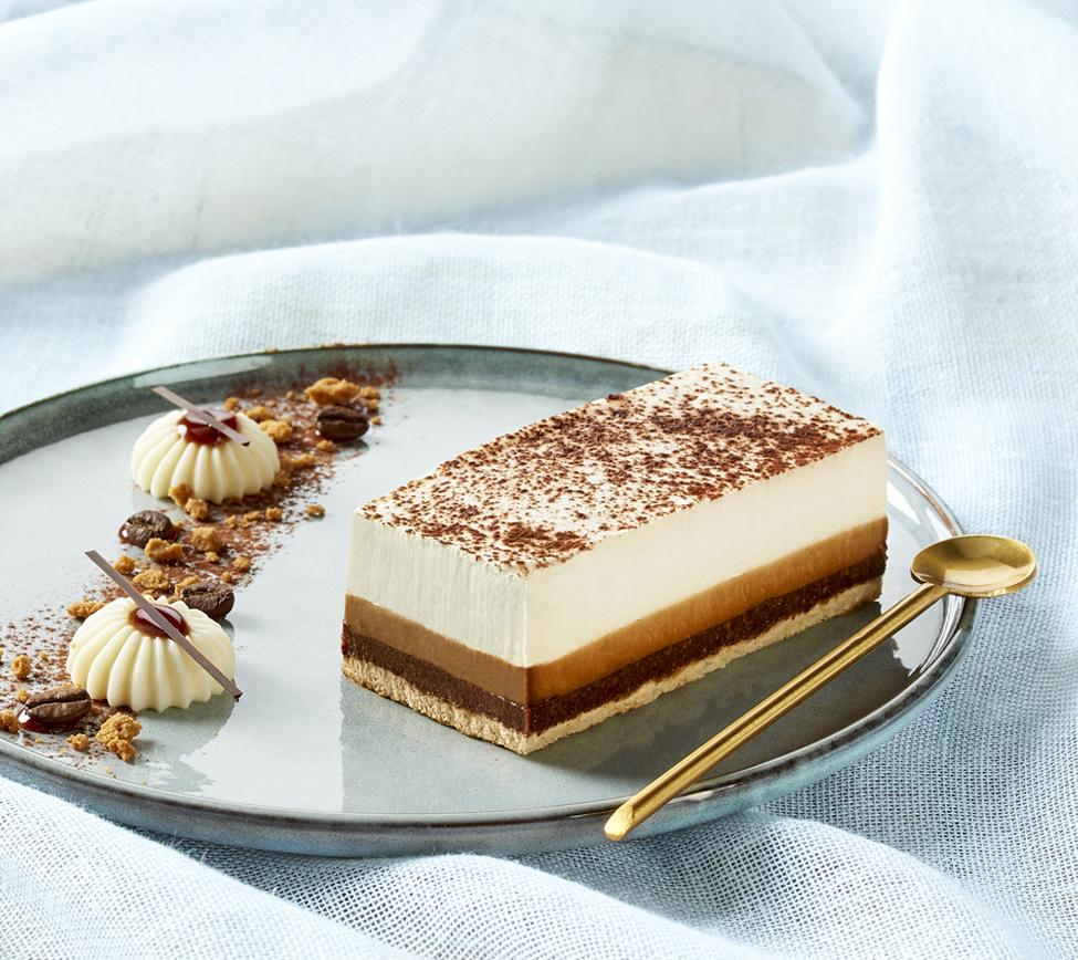 Sponge cake, crispy layer of speculoos, coffee cream, vanilla whipped cream, cocoa powder.