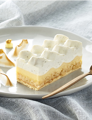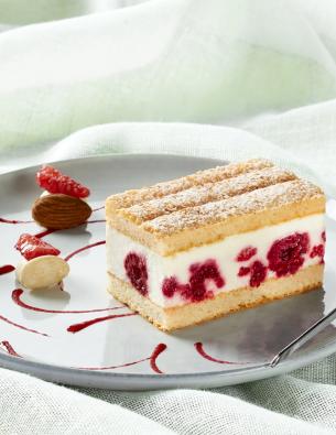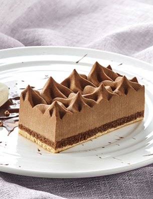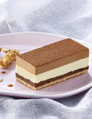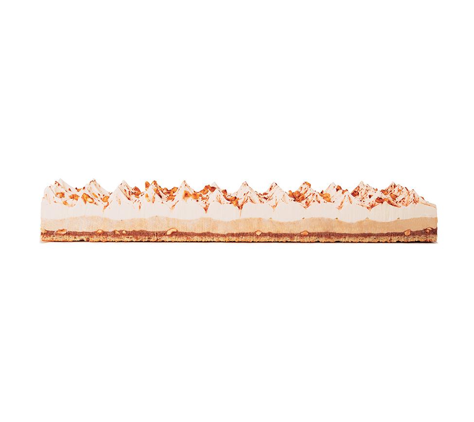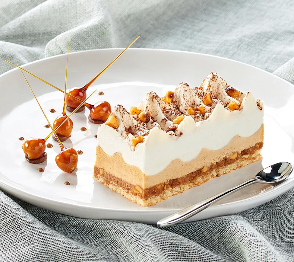 Biscuit aux amandes, croustillant au chocolat au lait et noisettes, mousse noisette et praliné, mousse à base de crème fouettée à la vanille, décor noisettes caramélisées.