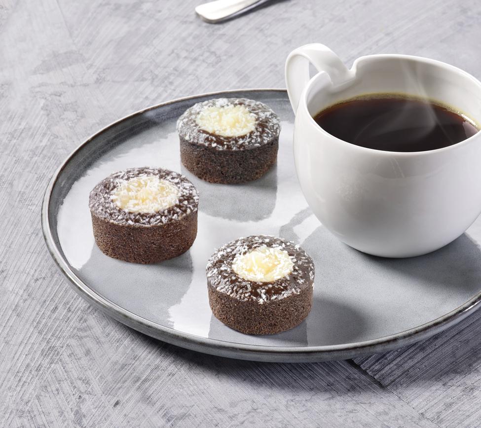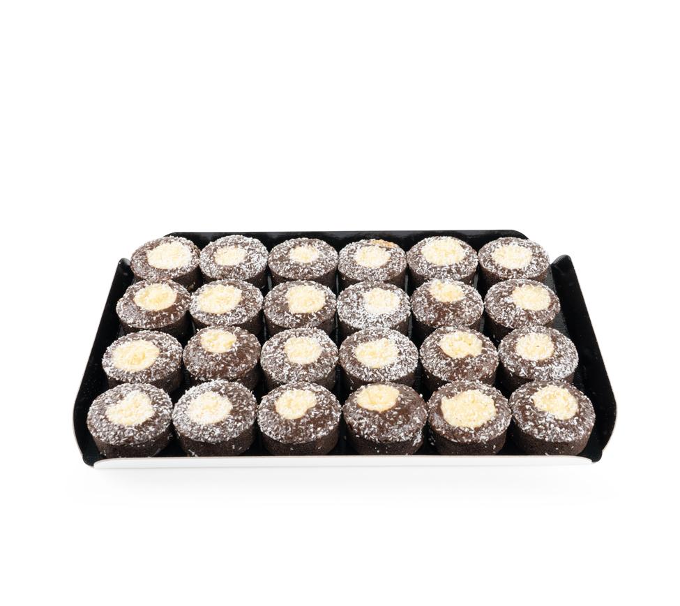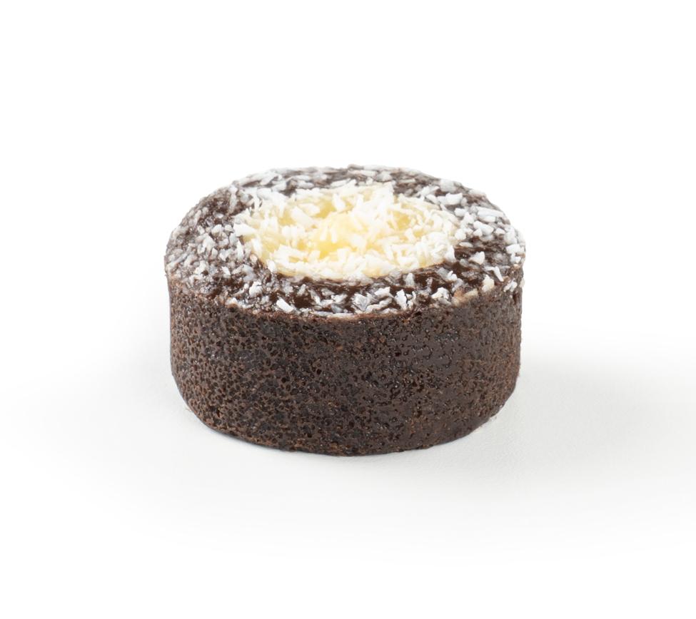 Offre mono-variété : appareil au fromage blanc et chocolat noir, décor noix de coco râpée (13% chocolat).