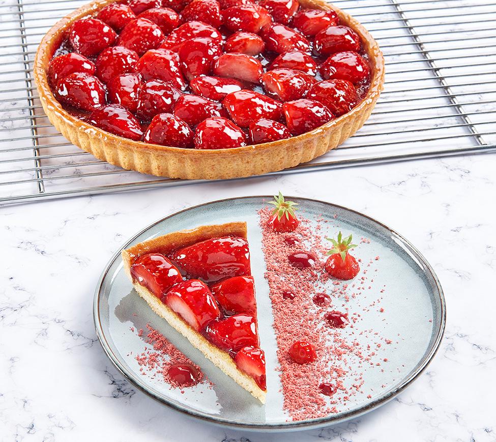 Pâte sablée, crème frangipane, coulis de fraises, demi-fraises. (37% de fraises)