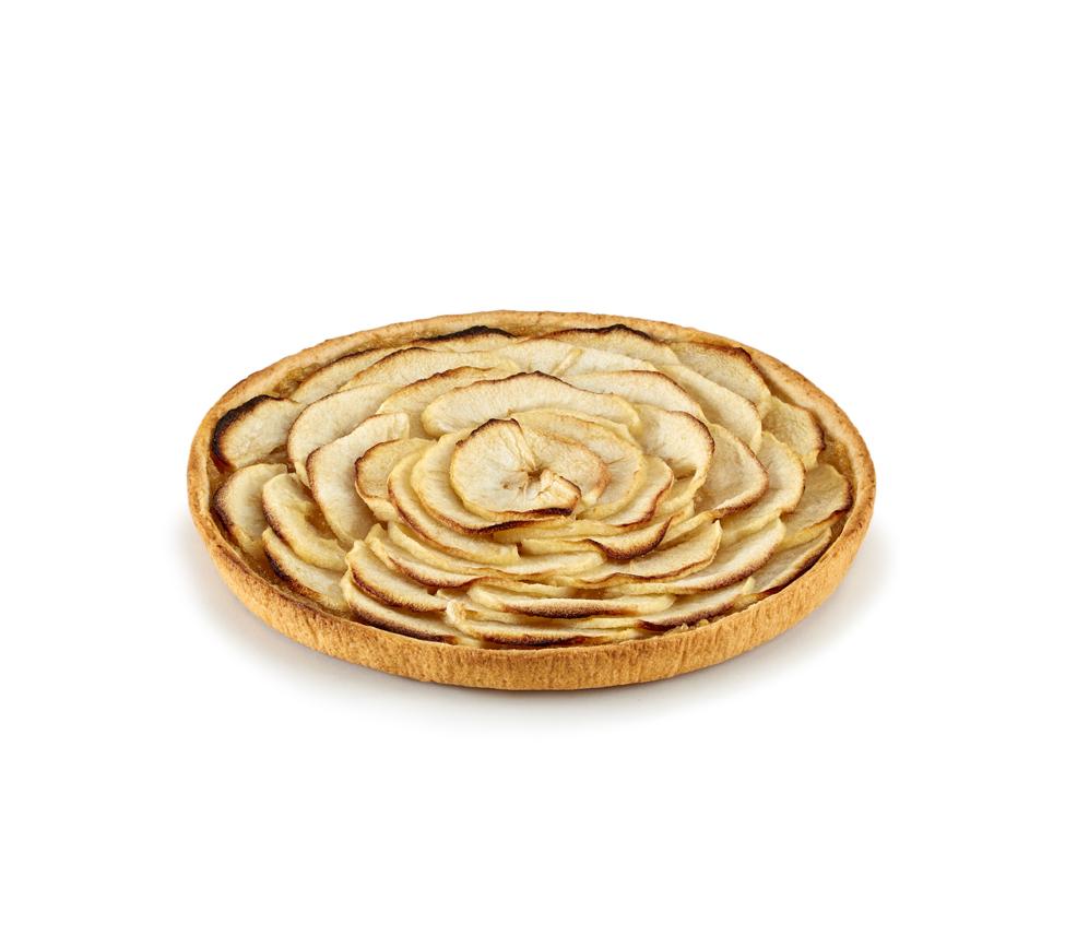 Pâte brisée, pommes fraîches en purée et lamelles. (69% de pommes)